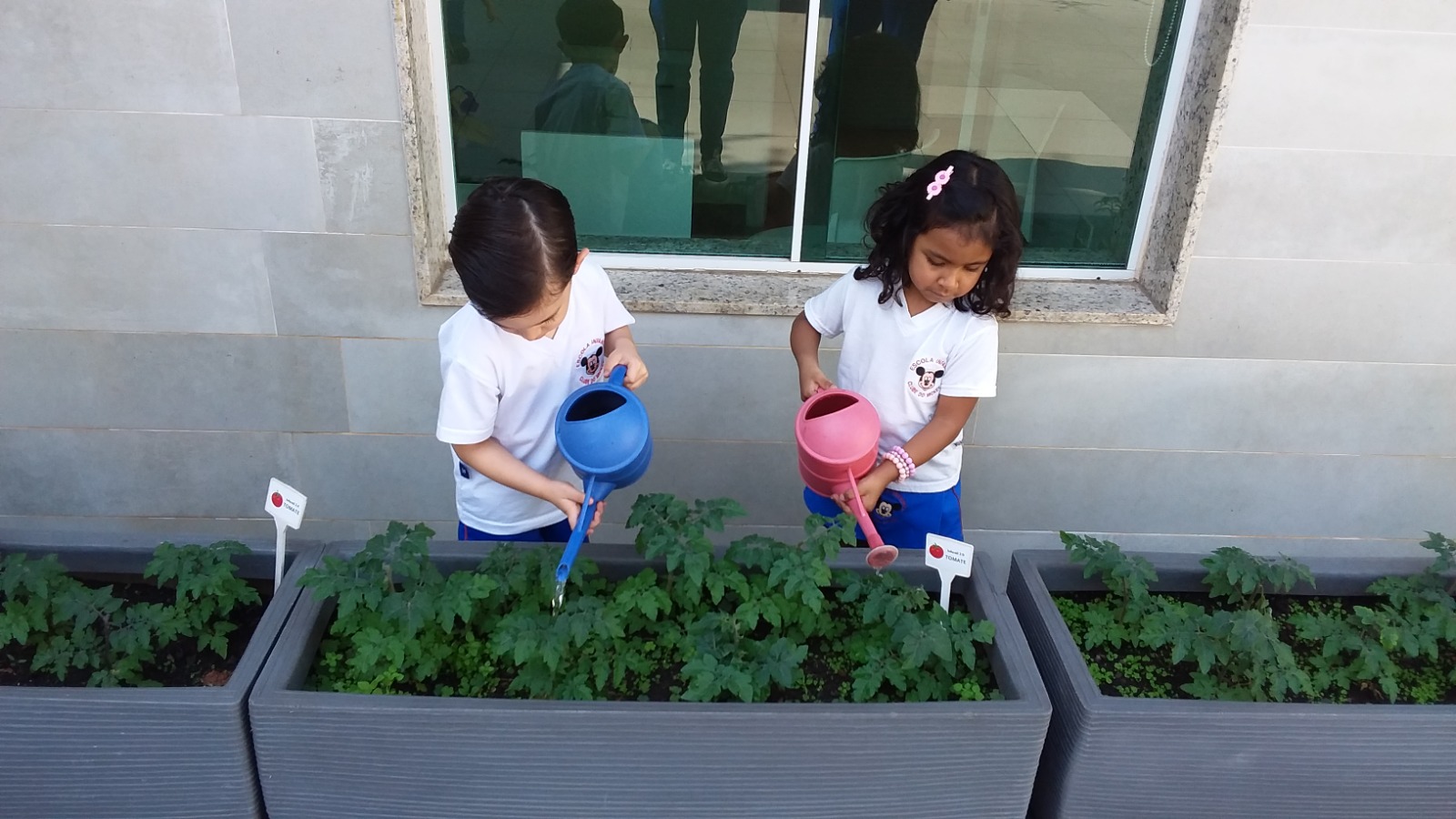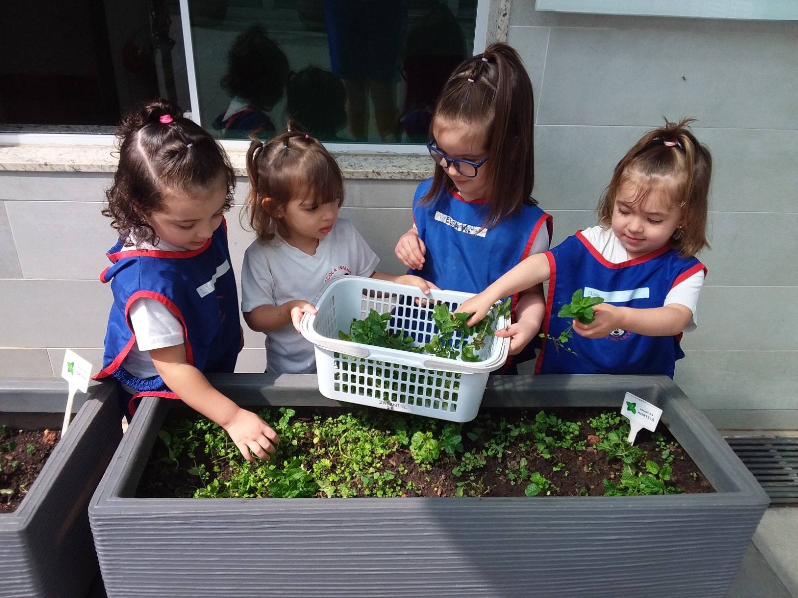 As crianças cuidam de hortaliças, legumes e flores, aprendendo sobre o ciclo do plantio, a colheita e a importância de uma alimentação saudável.